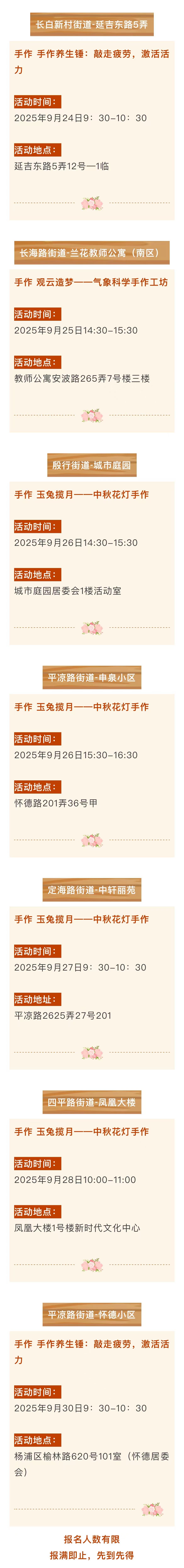 请市民至居委会报名,具体安排以居委会通知为准;请遵守活动现场秩序,文明参与各项活动!