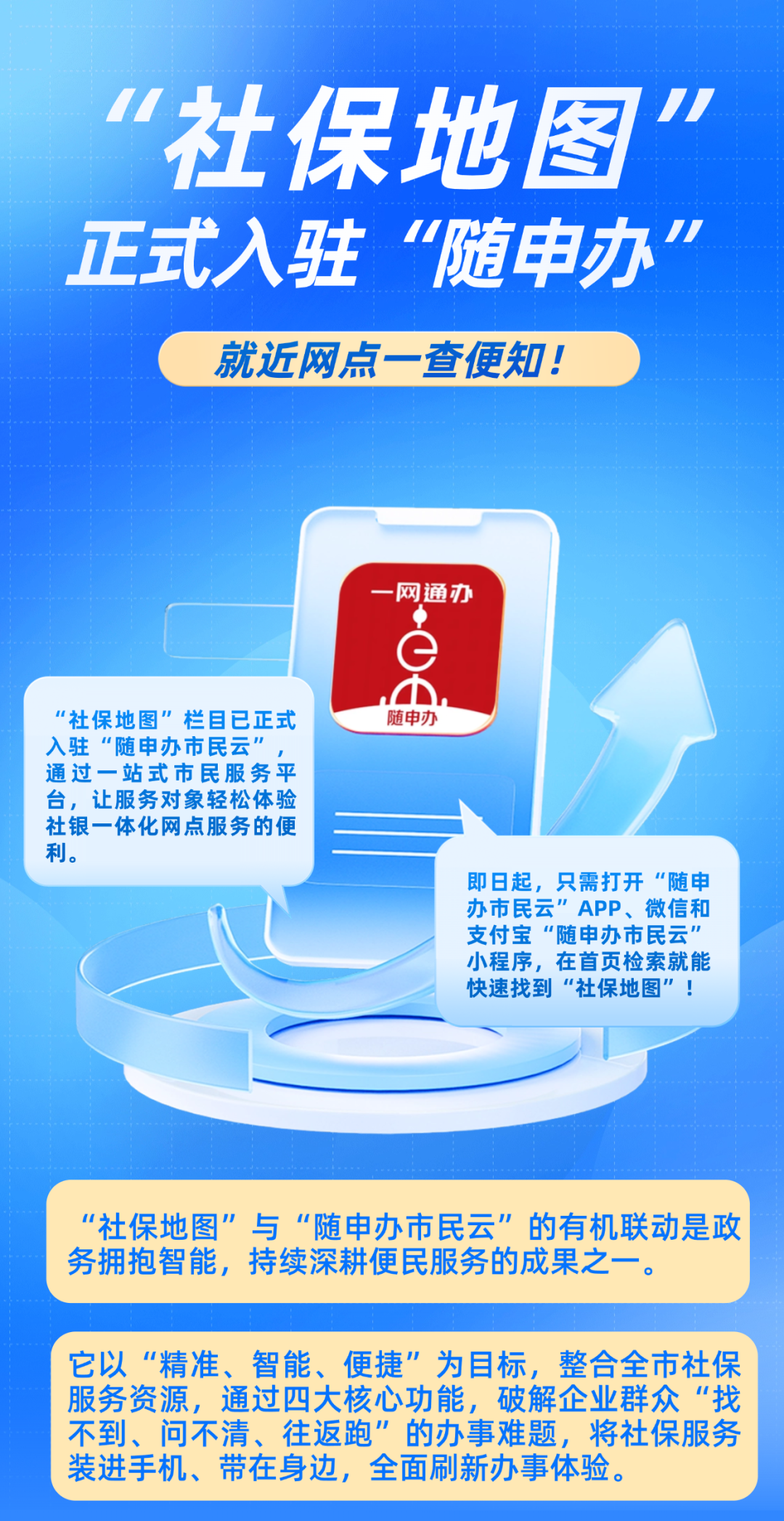 上海一网通办总门户介绍,“社保地图”栏目已正式入驻“随申办市民云”,通过一站式市民服务平台,让服务对象轻松体验社银一体化网点服务的便利。即日起,只需打开“随申办市民云”APP、微信和支付宝“随申办市民云”小程序,在首页检索就能快速找到“社保地图”,普陀居民快试试吧!
