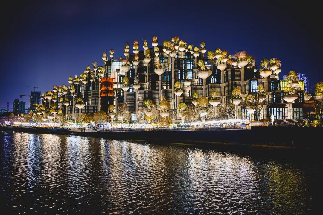 天安千树以其独特的建筑形态和璀璨的灯光设计,成为光影节的一大亮点。外立面方面,建筑外观上种植的近千棵树、阶梯式的梯田如瀑布般倾泻而下,不同高度、大小和形状的花盆柱从地面向上生长,层次感十足。