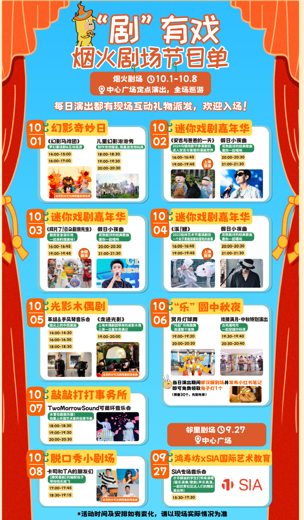 10月1日到10月8日,鸿寿坊启动“烟火剧场开心季”,老上海的里弄空间将变身“开放式狂欢剧场”!中心广场内乌镇戏剧节同款剧目、光影木偶剧、光影泡泡秀、创意打击乐秀、脱口秀轮番上演!为孩子们打造童话般的节日记忆,也让成年人找回童年乐趣。