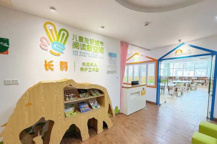 长寿路街道儿童友好城市阅读新空间以“自然、温暖、启智、安全”为设计理念,打造集阅读、游戏、社交、探索于一体的综合性儿童活动天地。空间采用原木色地板搭配绿色、黄色等柔和色彩,顶部以星空、云朵造型灯饰点缀,大面积窗户引入自然光,整体氛围明亮温馨,充满童真与活力。