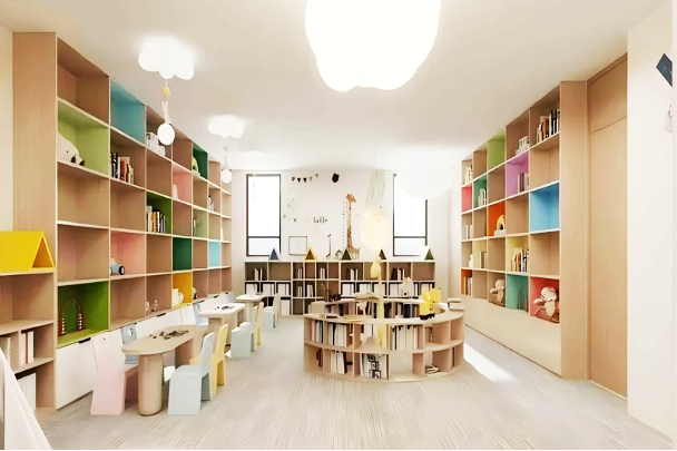 空间内含多个功能分区:1.阅读探索区。沿窗区域打造开放式书架长廊,分层陈列绘本、科普读物等,书架高度贴合3-12岁儿童身高,方便自主取放,激发阅读兴趣。2.互动活动区。空间中央设置3组圆形白色矮桌与座椅,可供30余名儿童同时开展手工、绘画等活动。空间内配备多媒体智能屏,可将空间随时切换为小型表演台、亲子课堂或主题活动场地,灵活满足故事会、手工坊、阅读讲座等多元场景。3.亲子互动休息区。中央设置圆柱形软包立柱与弧形沙发,形成半开放休息区,方便家长看护时短暂休憩,墙面采用圆角处理,全方位保障安全。