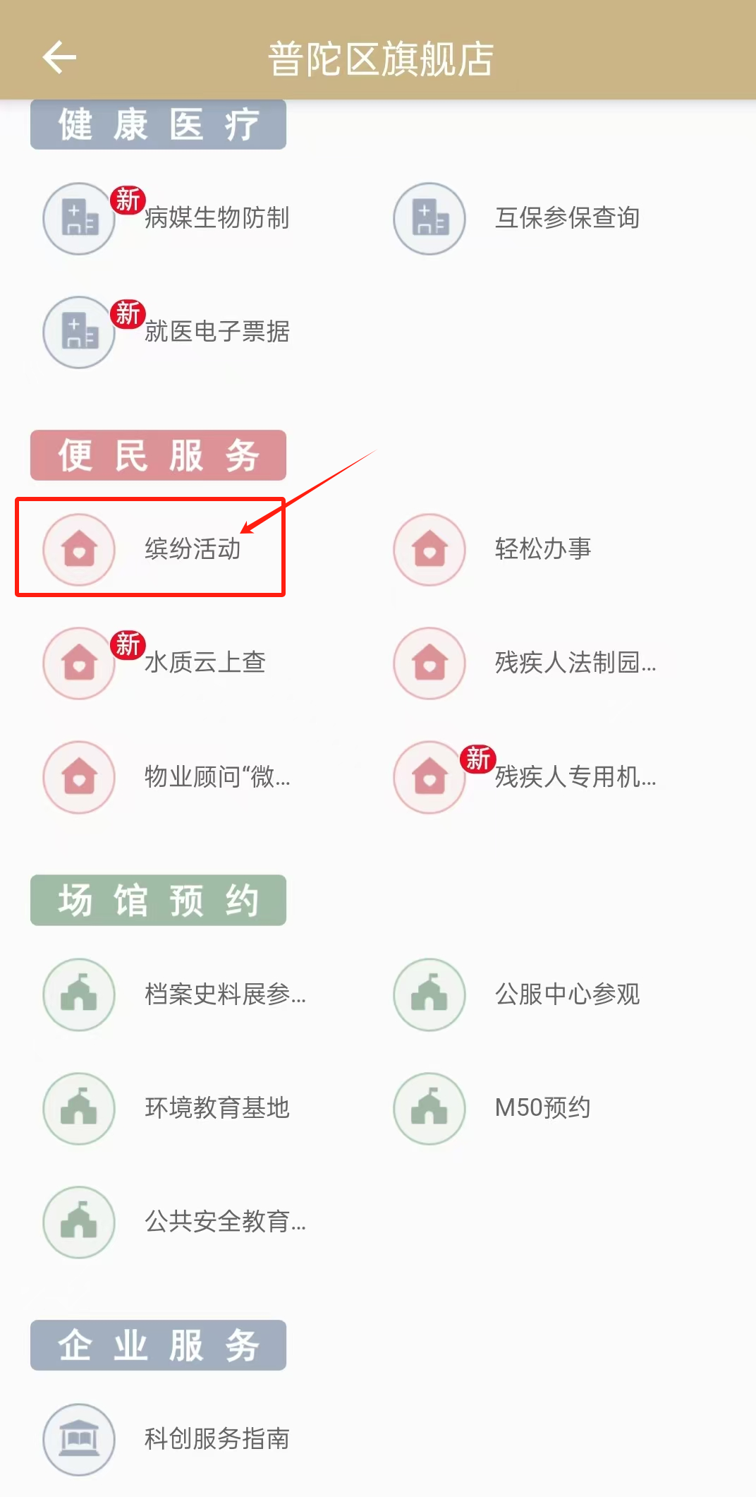 第二步:点击“靠‘普’服”,在“便民服务”栏目中点击进入“缤纷活动”