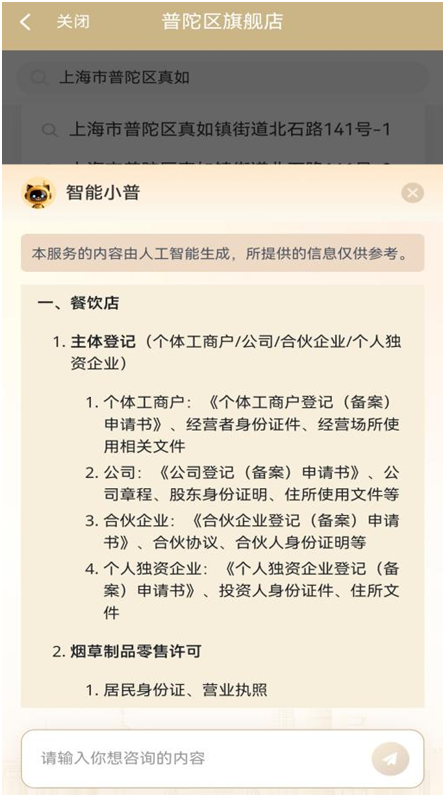不同行业、不同规模的店铺,办理流程千差万别。询问专区的智能小普能根据你咨询的情况,秒级生成开店问题解答。比如开便利店和开火锅店,需要的许可证明完全不同,智能小普会区分两者区别给予提示,避免你走弯路。