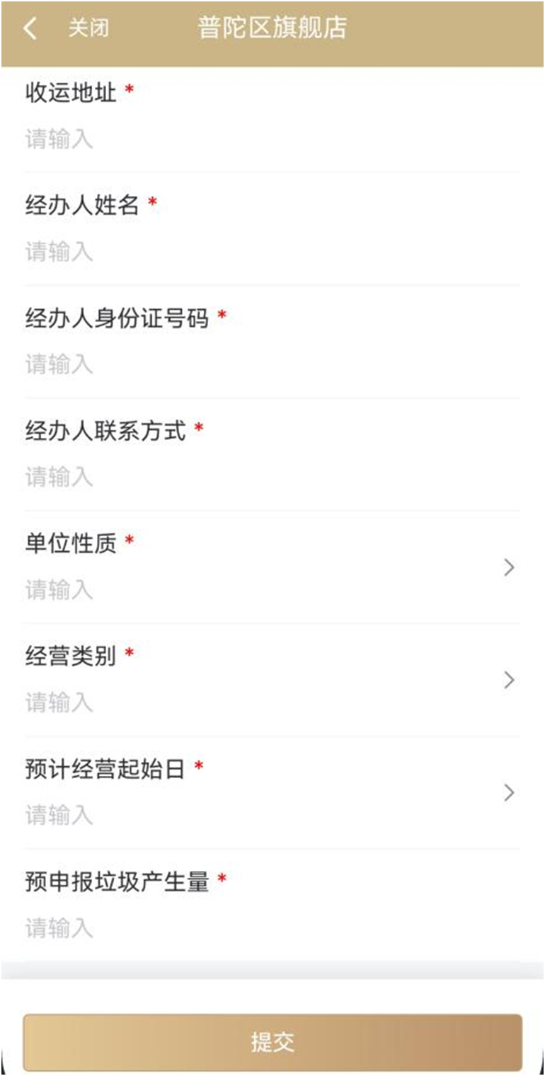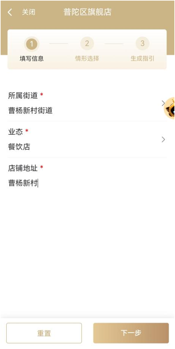 第一步填写信息:填写所属街道、业态、店铺地址,点击下一步