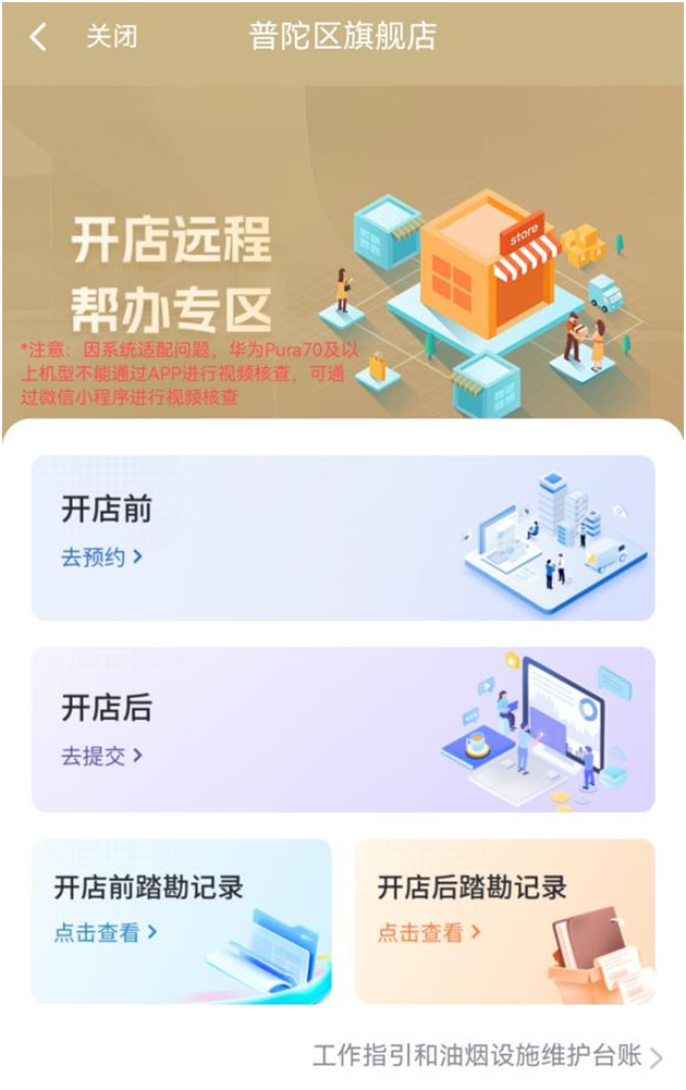 无需和审批局现场勘查科的工作人员约时间到现场勘察,只需通过开店踏勘申请远程视频踏勘,点一点开店前去预约,开店后则需提交,根据视频,有什么问题,工作人员会远程指出,不用创业者频繁去窗口。