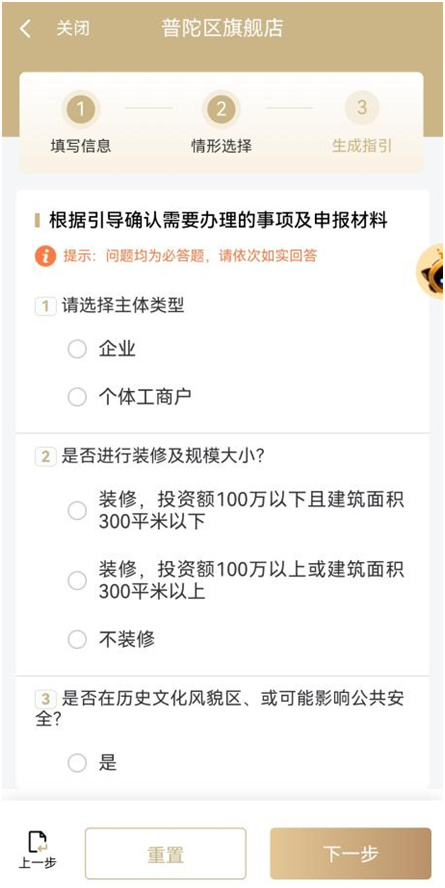 第三步生成指引:根据填写内容,生成多项相关指引,根据指引准备相关材料,不用重复咨询问题,减少创业者时间成本。
