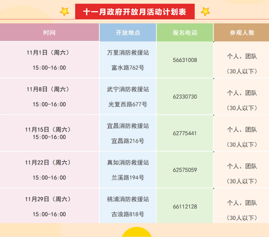十一月消防站开放计划来啦!快来普陀和蓝朋友们见面吧 2025-11-06 来源:普陀区人民政府
