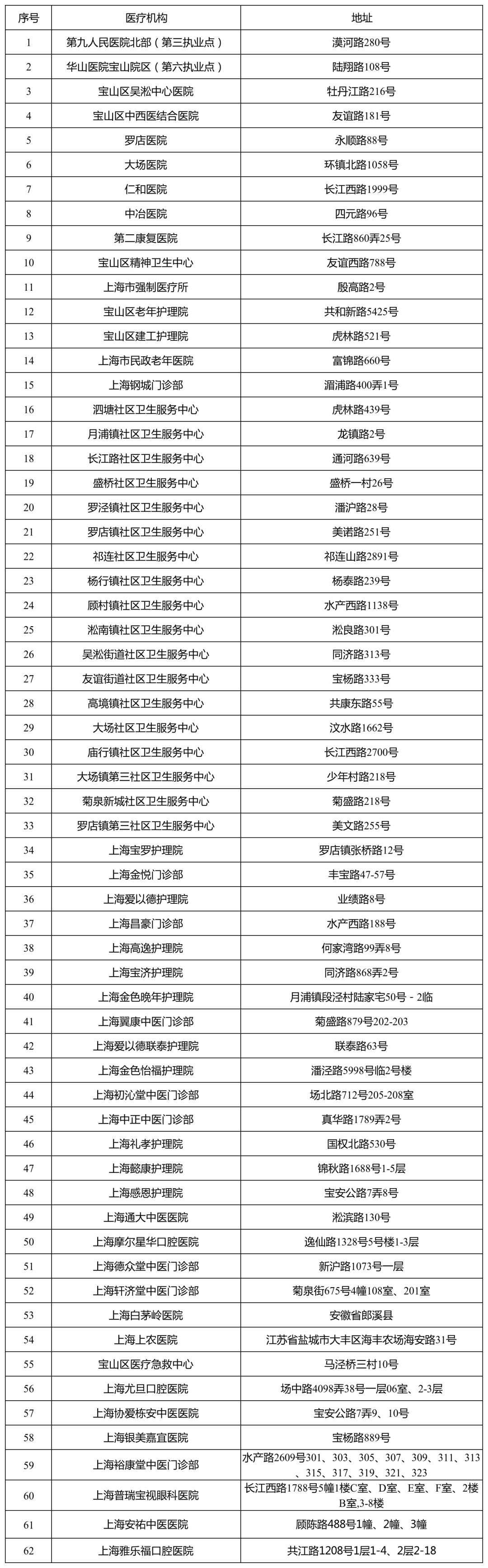 截至2025年11月6日,宝山区域内定点医疗机构数达62家,具体信息如下: