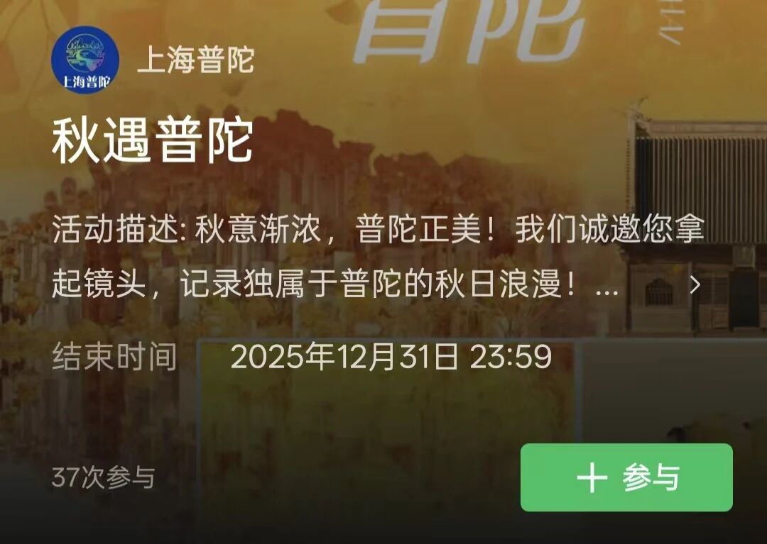 秋遇普陀,征集开启!捕捉限定秋景,赢精美奖品 2025-11-20 来源:普陀区人民政府