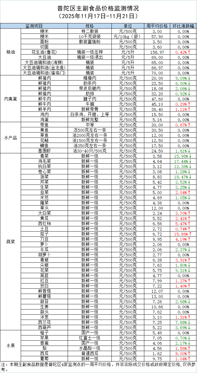 普陀区主副食品价格监测情况 (2025年11月21日)