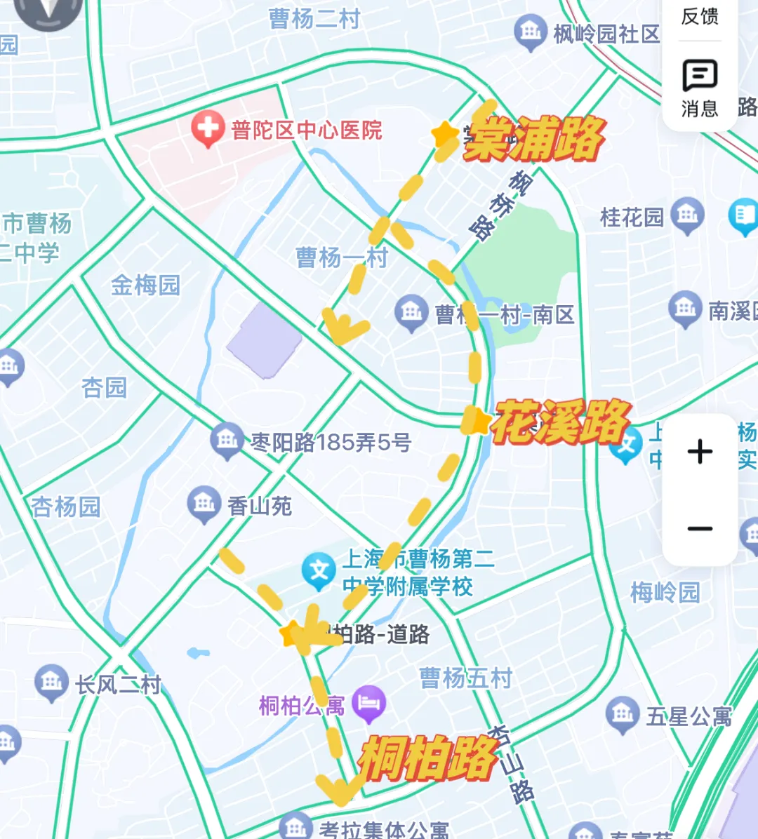 花溪路全长为1022.5米,是曹杨一村周边道路的重要组成部分,沿线集合了医院、中小学校、幼托机构、公共服务阵地、养老院等诸多综合服务。2021年,本市相关管理部门通过优势资源整合,将其打造成舒适、平整、美观的精品示范路。