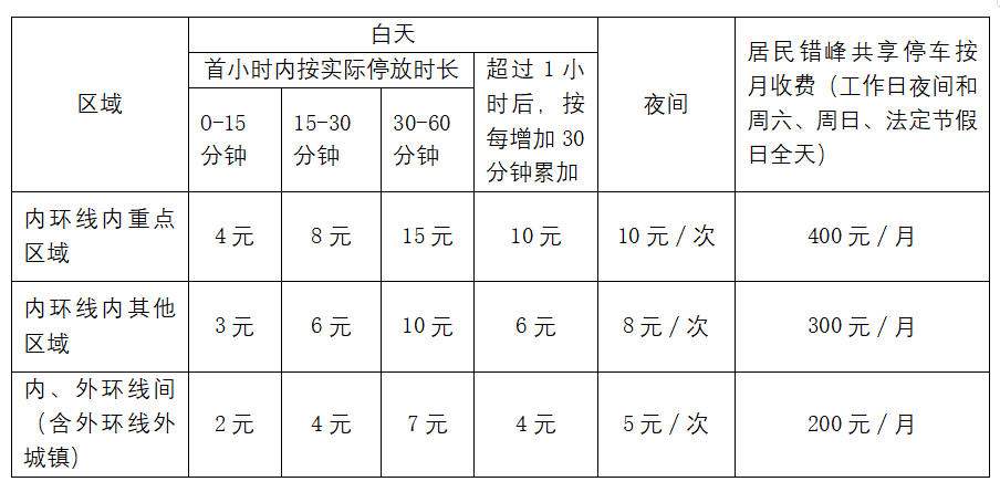 根据市价格主管部门会同市财政部门核定的本市智慧道路停车场收费标准和计费规定(如下表),本次新增的3处内环线内其他区域,2处内、外环线间的收费标准和计费规定执行如下: