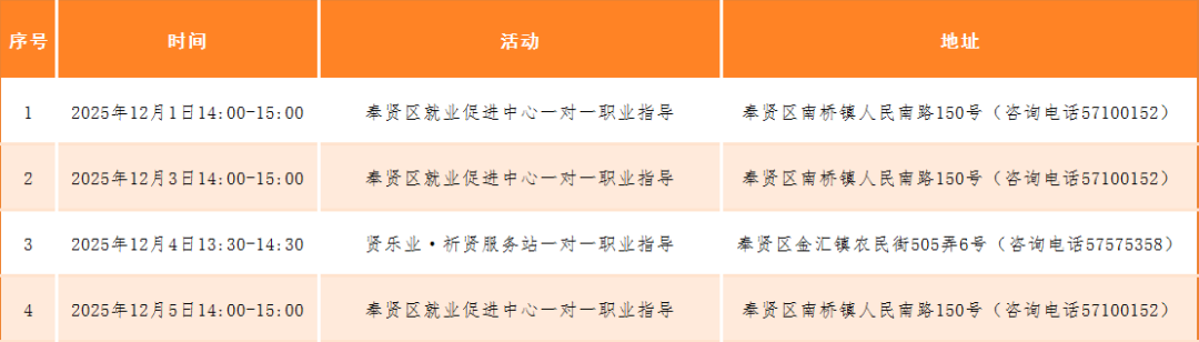 奉贤区“15分钟就业服务圈”12月1日~12月5日站点活动安排