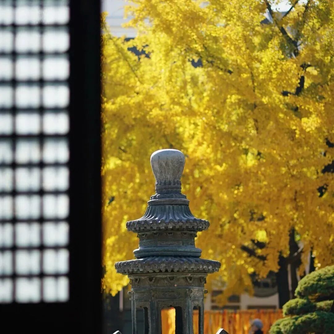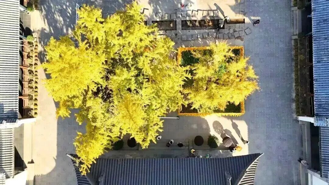 随着气温降低,古银杏树叶片渐黄,在阳光下闪烁金色光芒,微风拂过,树叶沙沙,似在喃喃低语。接下来几周,它将迎来最美时刻,满树金黄与古朴大殿相互映衬,构成如梦如幻的静谧画卷。