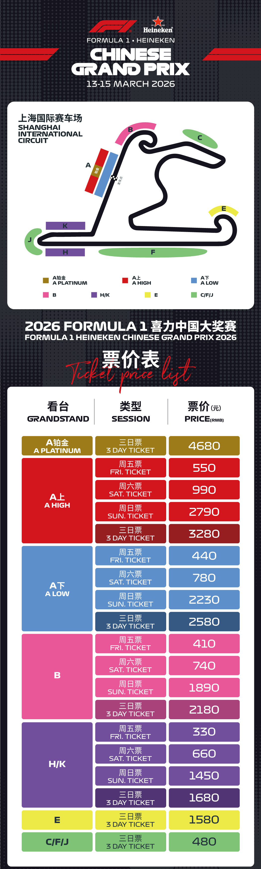 除A看台铂金区域、E看台和C/F/J草地看台仅售三日票外,A看台其他区域、B看台、H/K看台均提供周五、周六、周日单日票和三日票选择!