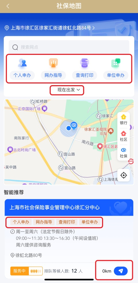 根据个人需求,确定出发时间(选择“现在出发”或“其他时间”)和业务种类(“个人申办”“网办指导”“查询打印”“单位申办”按需勾选),然后按智能推荐的办理网点前往即可(点击右下角“蓝色箭头”可开启导航)。系统会根据您的实时位置、要办的业务、想办的时间,自动按“最近距离”排序。每家网点还附有“热力显示”,忙、闲一看便知!