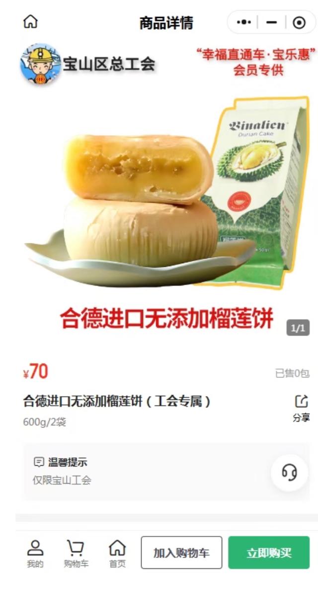 在工作间隙、午后茶点或聚会时,轻松分享一份“重口味”的快乐,在咬开的瞬间,解锁独特的美味,让你感受到醇厚与满足,仿佛将东南亚的阳光包进酥皮里!本周区总工会联合罗泾镇总工会推出:合德进口无添加榴莲饼。