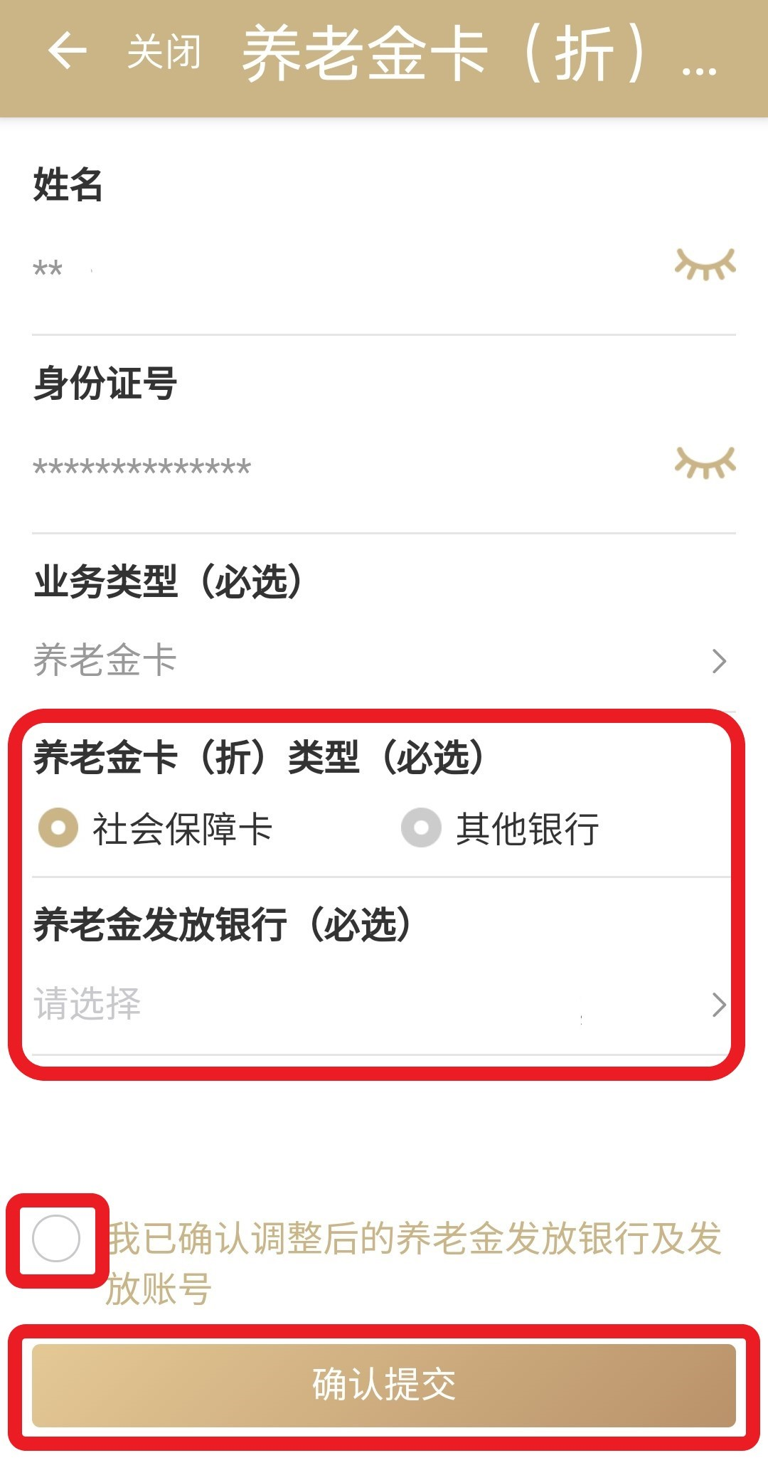 确认基本信息(姓名、身份证号)无误后,选择“养老金卡(折)类型(必选)”为“社会保障卡”,并勾选“我已确认调整后的养老金发放银行及发放账号”后,点击“确认提交”,即可完成申请。