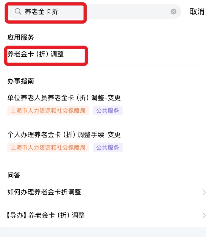 在搜索结果栏中选择“应用服务”—“养老金卡(折)调整”;