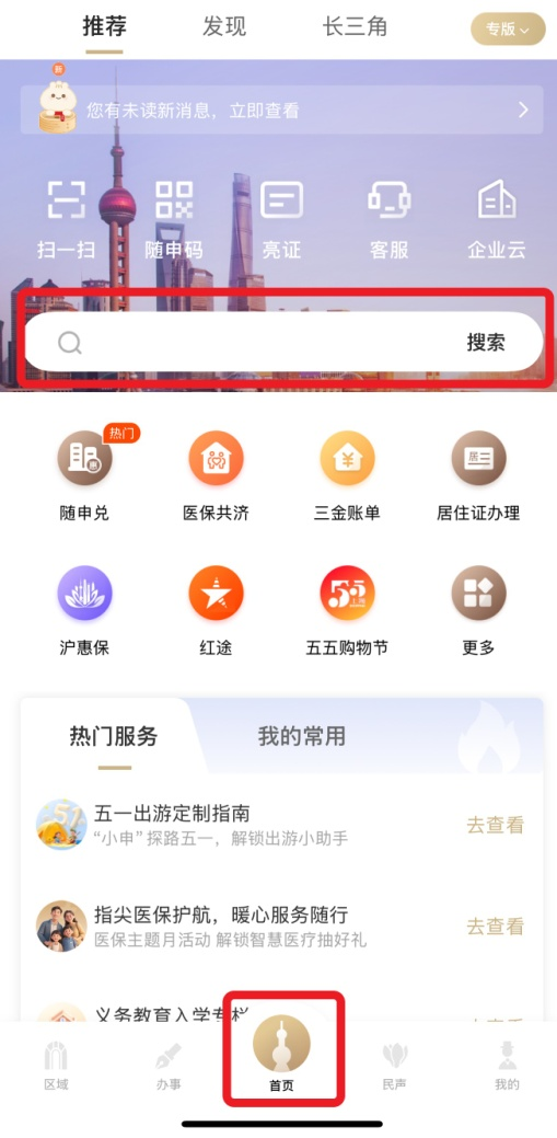 登录手机“随申办市民云”APP,在首页搜索栏中输入“养老金卡(折)”并点击“搜索”;