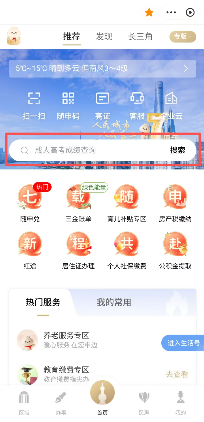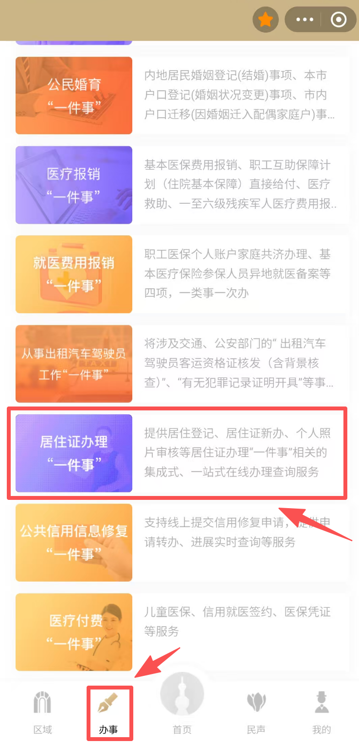 首页搜索“居住证办理一件事”,或通过下方菜单栏“办事”—“居住证办理一件事”进入服务。