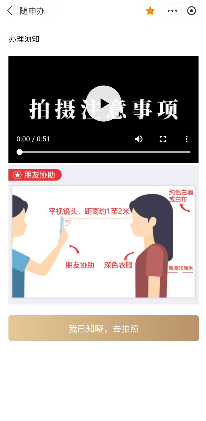 2、以“本人办理”为例,按照要求和提示拍照上传申请人本人的人像信息,在线采集照片。
