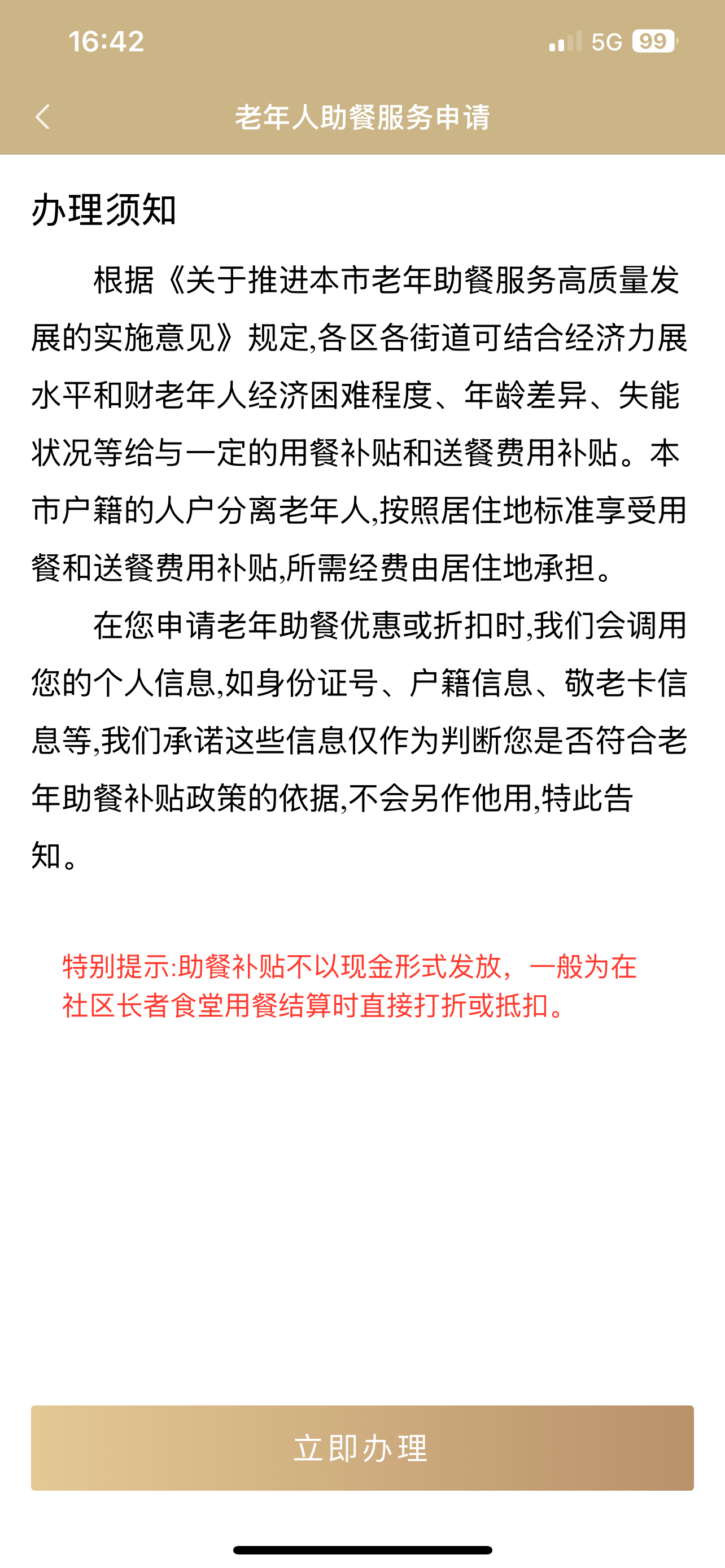 2.线上申请:打开随申办市民云APP或随申办小程序,搜索“老年人助餐服务申请”,按提示操作,足不出户即可办理。