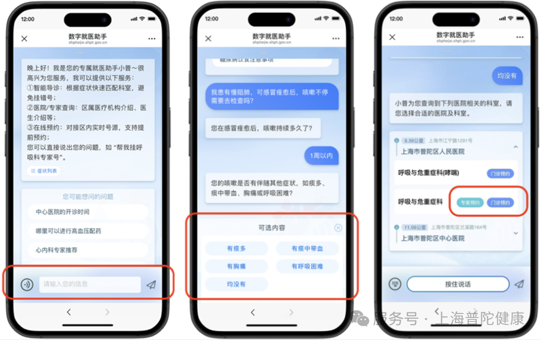 比如一句“我膝盖疼,上下楼梯更疼”,“小普”会接着问几个简单问题:“疼了多久啦?有没有肿起来呀?”根据您的回答,它会智能推荐“普陀区中心医院骨科”或“社区卫生服务中心康复科”,助您精准挂号。