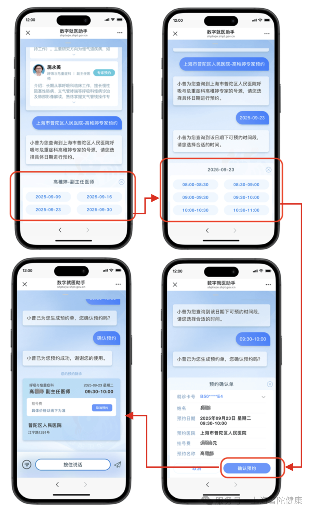 找到合适的专家后,不用再跑医院排队。跟“小普”说“我想约中心医院的张**医生”,它会自动列出该医生的可预约时段,您只需选择日期和具体时间,“小普”就会自动生成预约单,确认后即可完成预约。