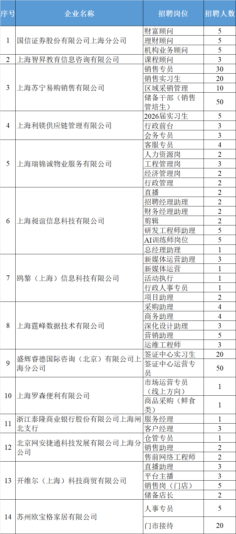 还在找工作吗?本周四,普陀“职”等你来!本次招聘会集结14家优质企业,覆盖金融、信息科技、现代服务等多个热门领域,提供300余个优质岗位。现场还将开设就业指导专区与政策咨询窗口,为求职者提供简历优化、职业规划、就业创业扶持政策解读等一站式服务,助力求职者高效求职、精准择业。