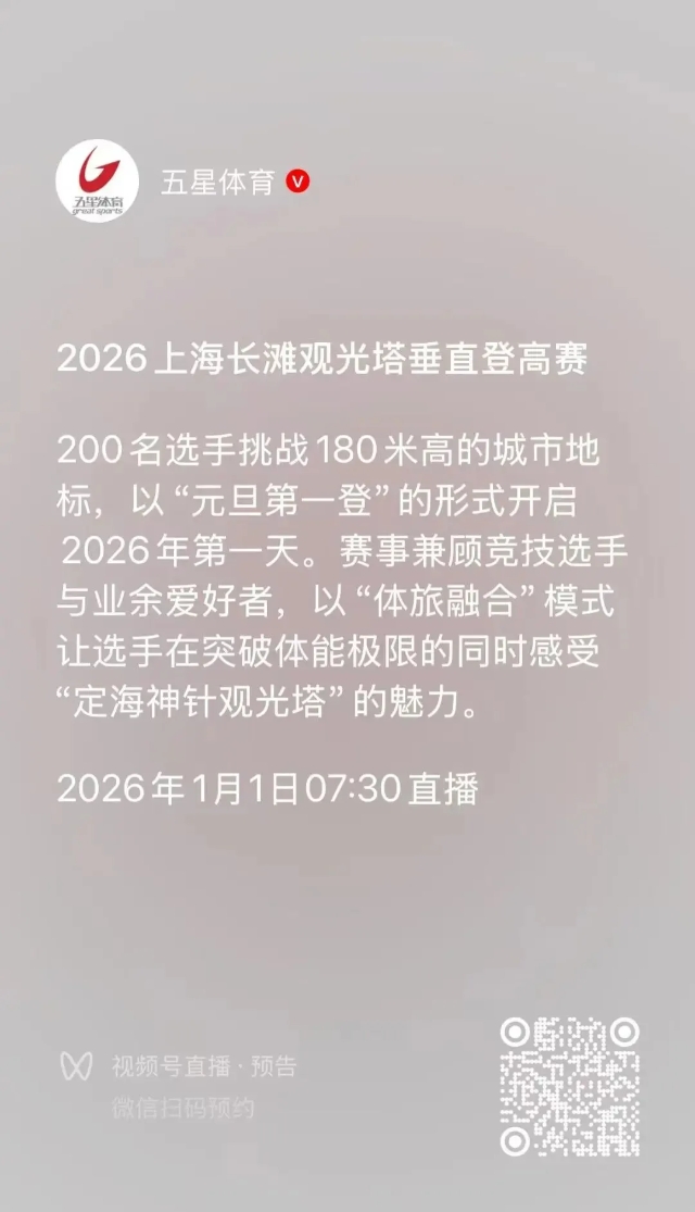 “中国体育彩票”2026上海长滩观光塔垂直登高赛开赛在即!本篇参赛手册包括:活动安排、楼层设置、参赛包领取&物品寄存、奖项设置、参赛&完赛包清单、号码簿查询、物资邮寄、交通攻略、视频直播、直播相册,共10项内容,请注意查收!