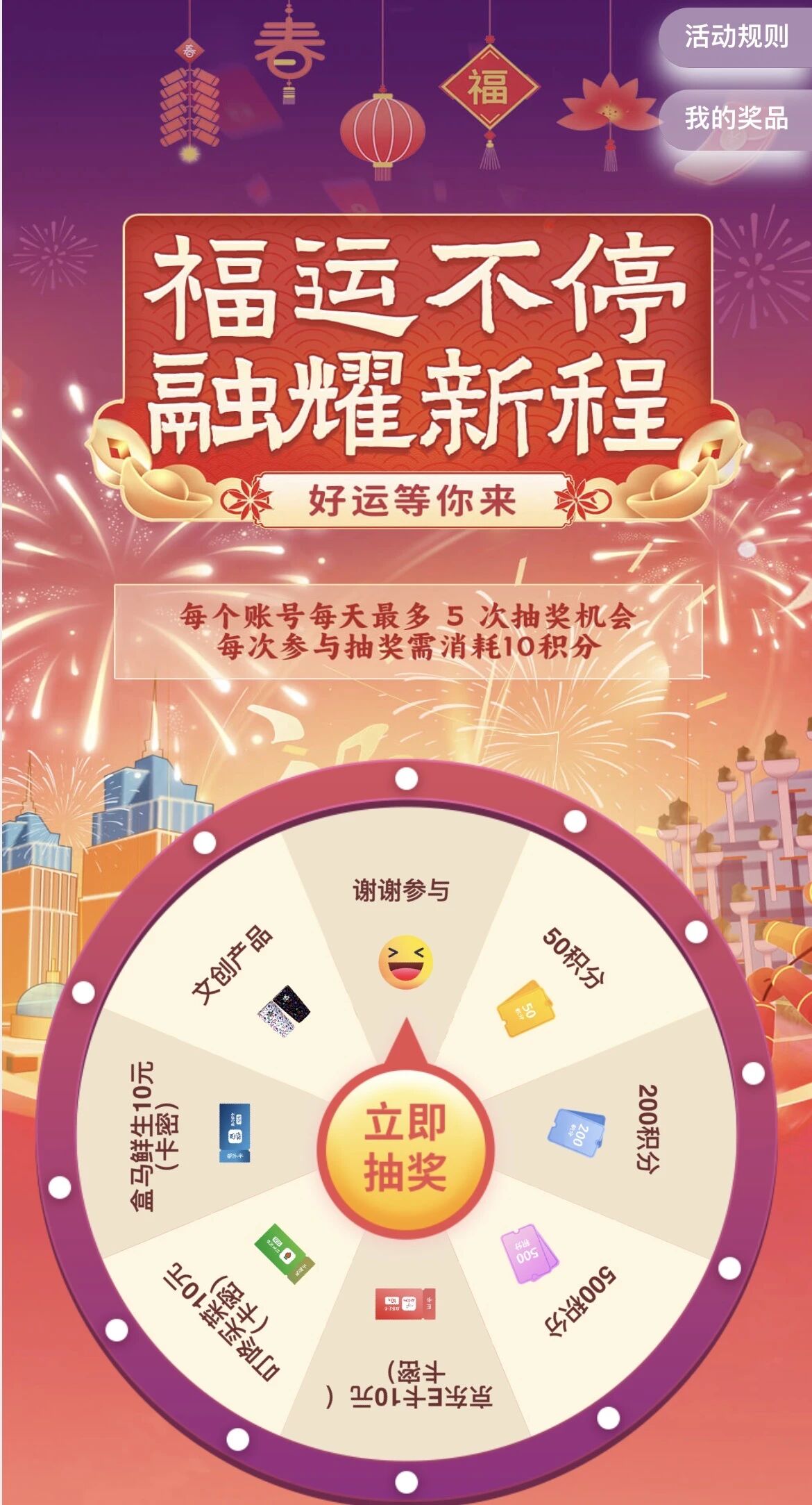 1.每次参与抽奖需消耗10积分,每个账号每天最多5次抽奖机会。