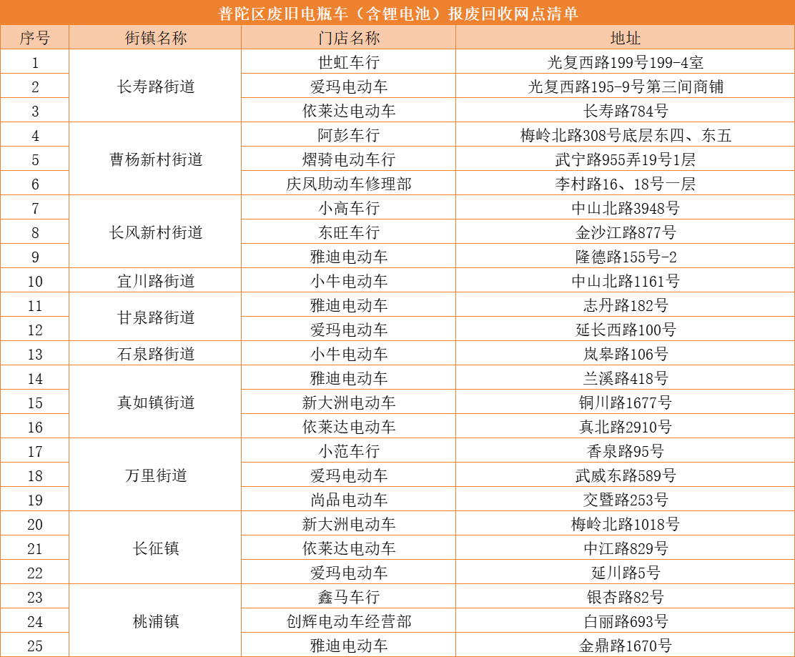 充电时突然起火、骑行中突发故障,电动自行车锂电池的安全隐患,你真的重视了吗?那些长期堆放在角落的废旧电瓶车占用着公共空间,老化锂电池在日晒雨淋后充电更易引发“热失控”!闲置的废旧电瓶车正悄然埋下威胁你我安全的重大隐患!为落实《电动自行车锂离子电池回收利用体系建设指南》及上海市废旧非机动车回收处置相关要求,有效防范化解电动自行车全链条安全风险,切实维护群众生命财产安全与社区环境整洁,普陀区在各街镇设立了废旧电瓶车(含单独废旧锂电池)回收点位,快来看看吧!