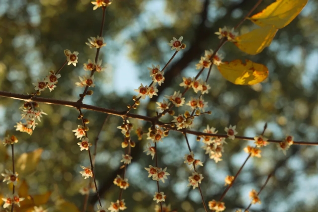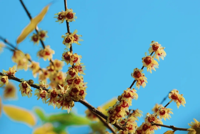 目前位于樱花大道与梅樱林交界处几树蜡梅已得了先机,阳光穿过枝丫,那些小灯笼似的花朵便莹润透明起来,仿佛能看见光在里面流动,细看那花,才懂造物的妙意,花瓣薄如蝉翼,却覆着一层蜡质的光泽,在冬阳下透出琥珀的质感。