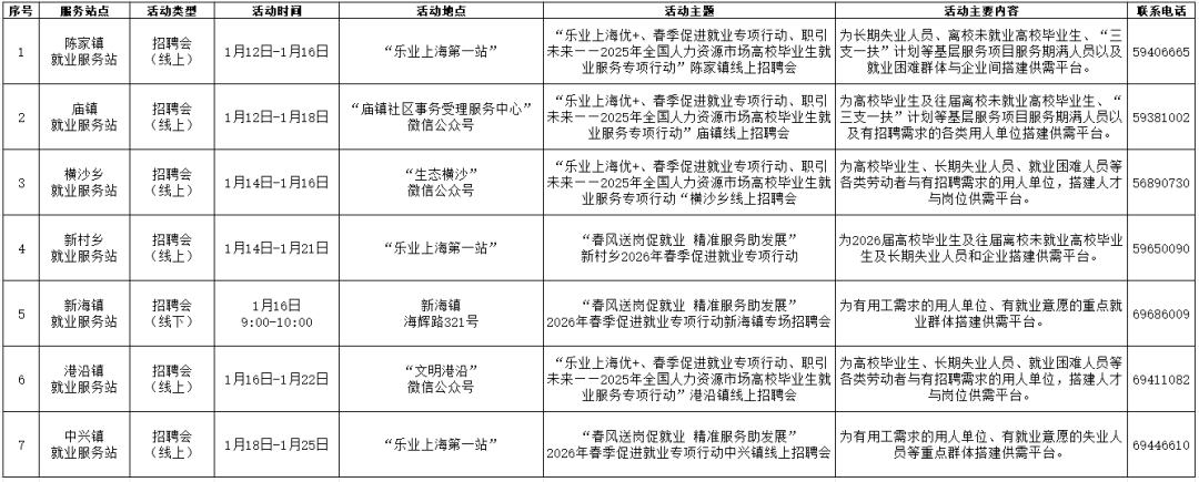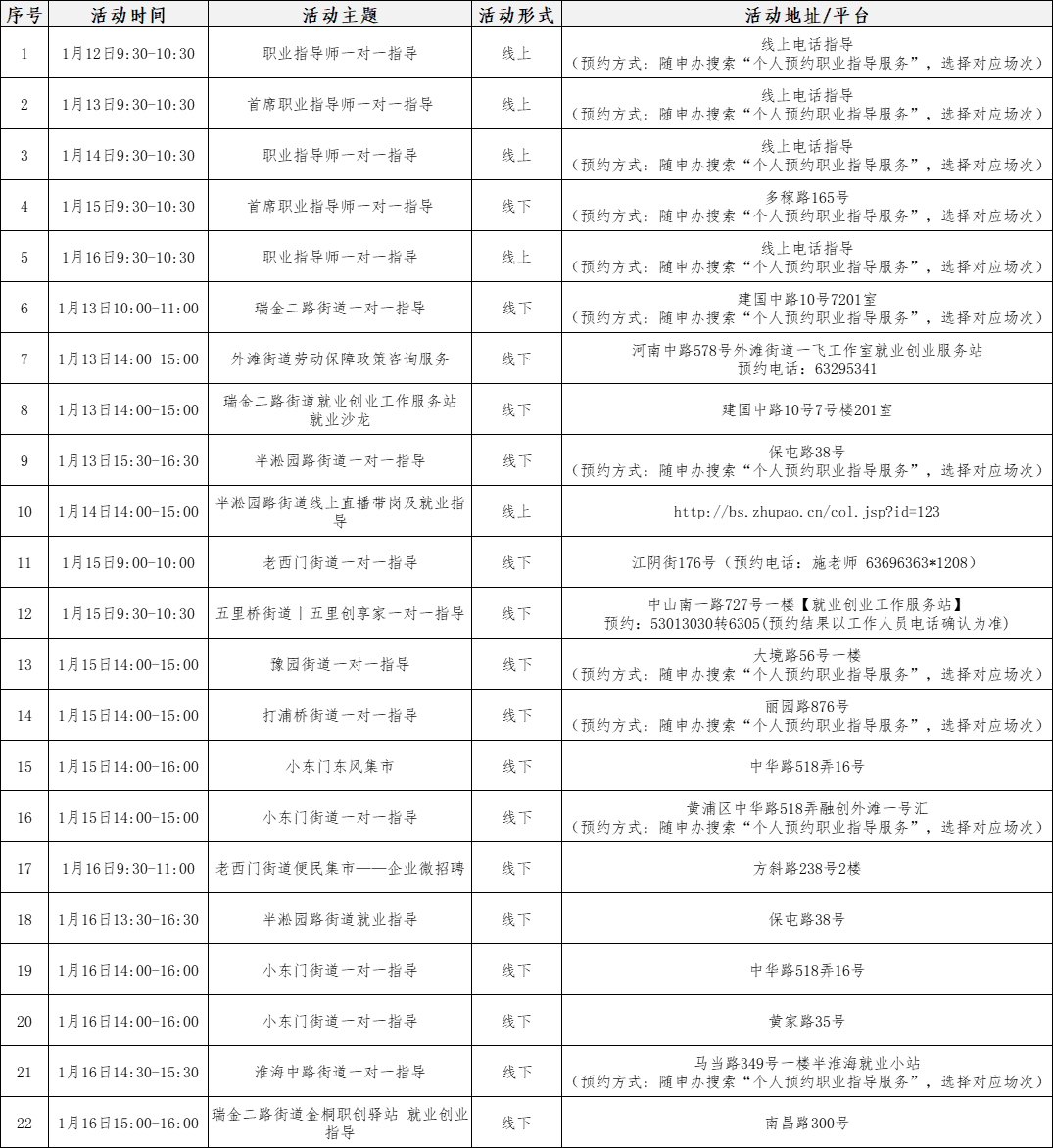 “15分钟就业服务圈”社区就业服务站点建设市政府实事项目作为人社部门常态化政府开放活动之一,我们将持续发布精彩服务内容,今天为大家带来黄浦区、长宁区、青浦区、崇明区、杨浦区、闵行区近期就业活动安排!