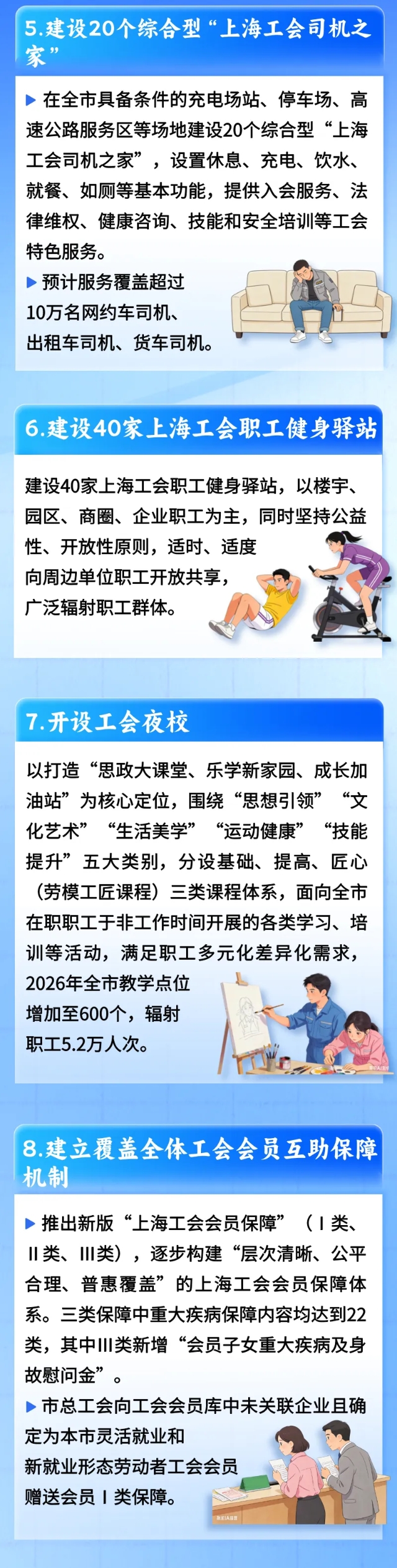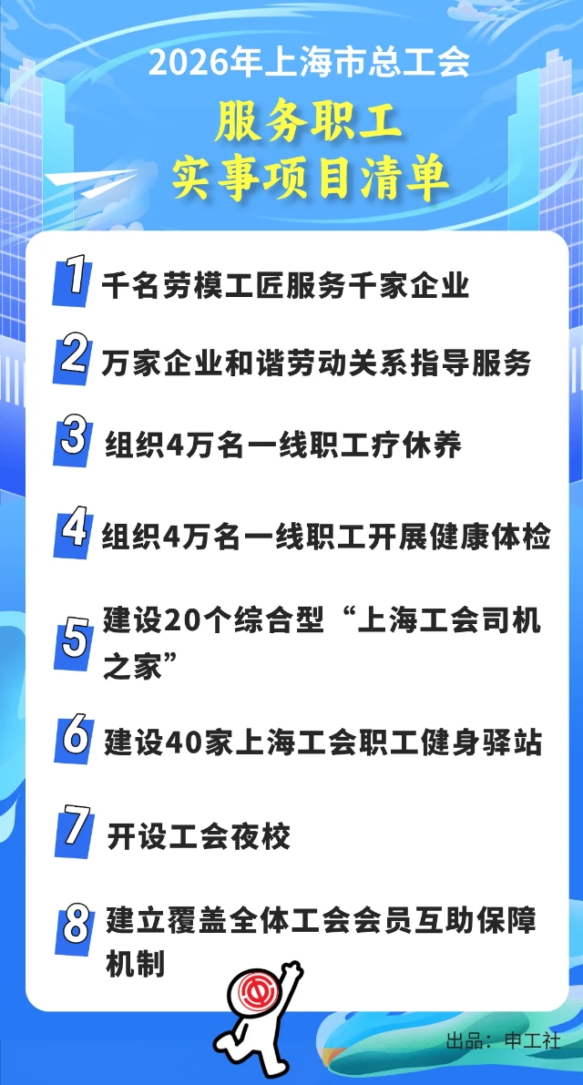 最新消息,上海市总工会公布,2026年8件服务职工实事项目!涵盖维权服务、技能服务、文体服务、帮困服务、健康服务、生活服务等6个大类。