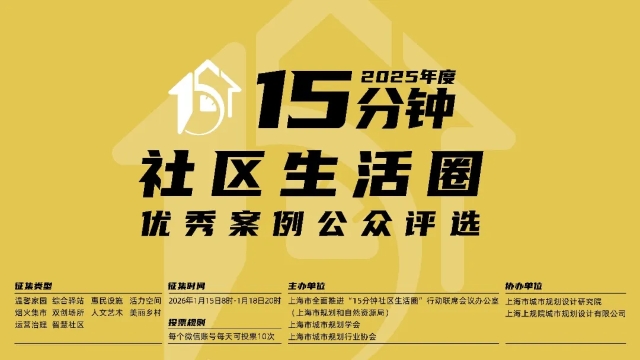 2025年本市积极推进“15分钟社区生活圈”行动,涌现出一批有品质、有亮点的示范项目。市“15分钟社区生活圈”联席办联合上海市城市规划学会、上海市城市规划行业协会,组织开展2025年度上海“15分钟社区生活圈”优秀案例评选工作。旨在通过评选,发现一批具有影响力、代表性和创新性的项目,展现基层治理创新智慧,体现共建共治共享实践成果,为建设“现代化人民城市”提供可复制、可推广的经验范式。快来参加投票吧!