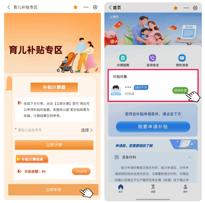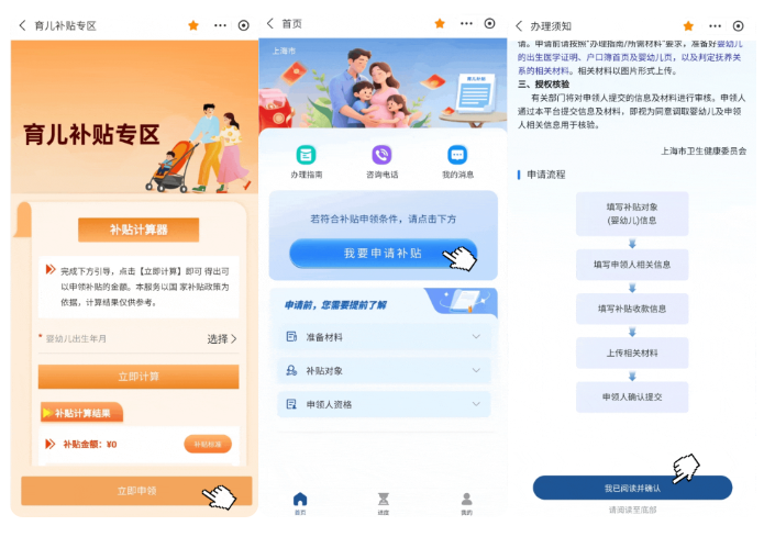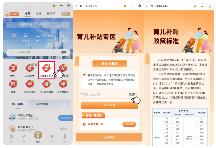 打开“随申办市民云”(APP/微信小程序/支付宝小程序),首页点击“育儿补贴专区”前往申领,还可通过“补贴计算器”快速计算补贴金额,并一键查看相关补贴政策标准。