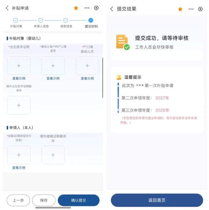 5、按页面提示上传婴幼儿(补贴对象)的出生医学证明、户口簿首页及婴幼儿页,以及判定抚养关系的相关材料,确认提交后等待审核结果。