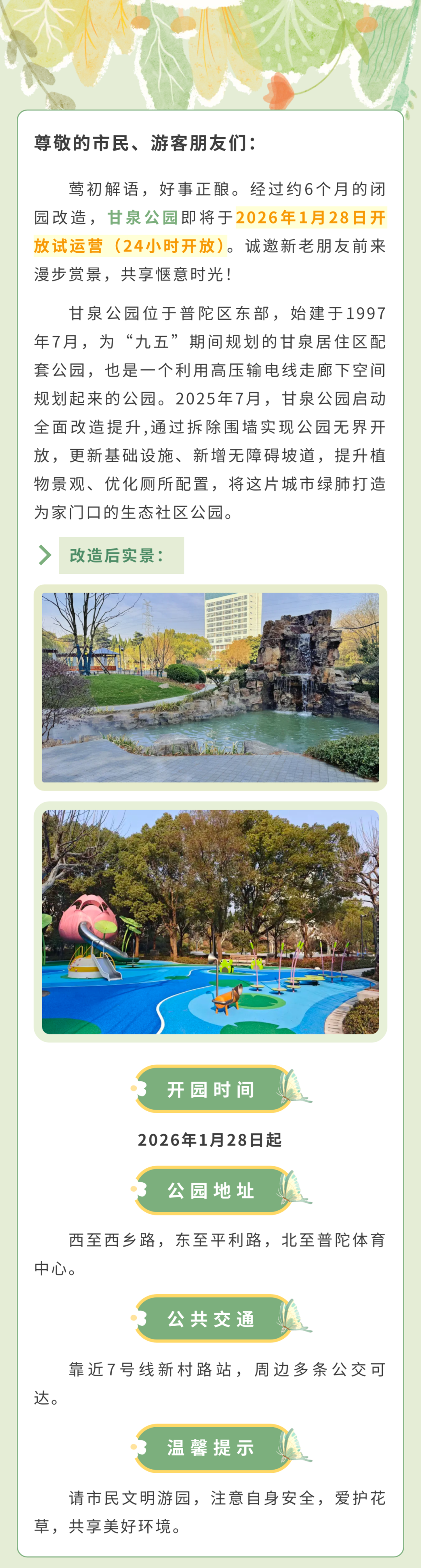 请市民文明游园,注意自身安全,爱护花草,共享美好环境。