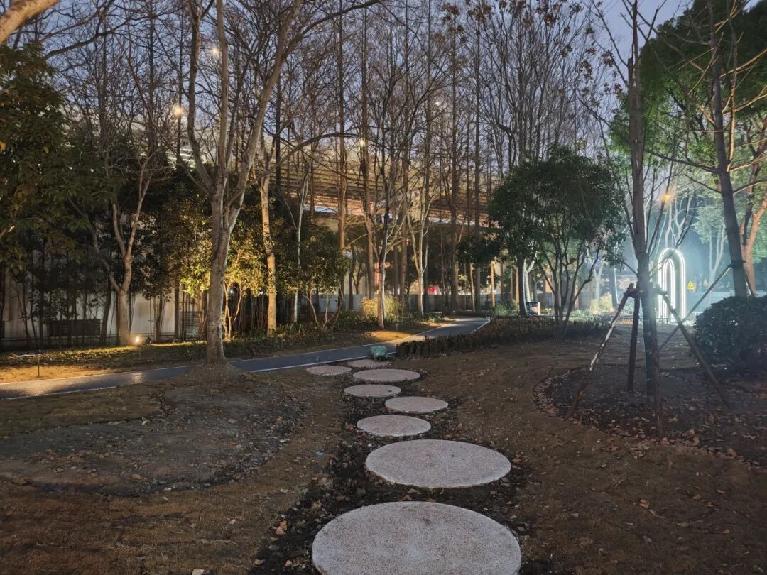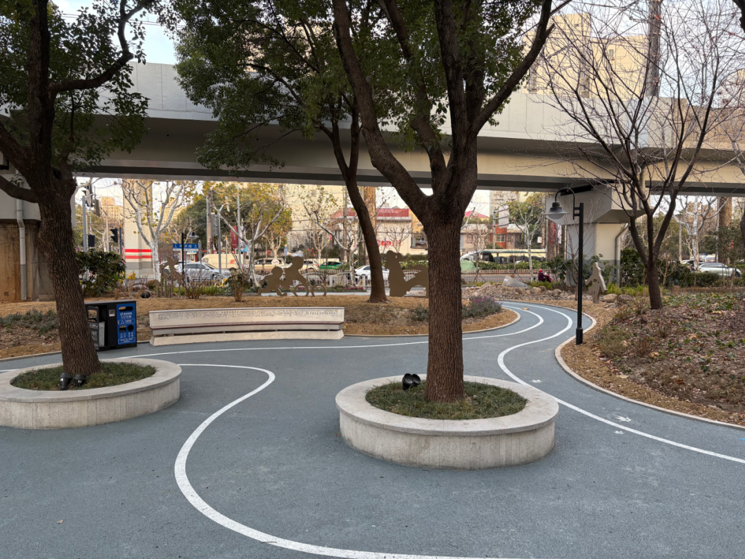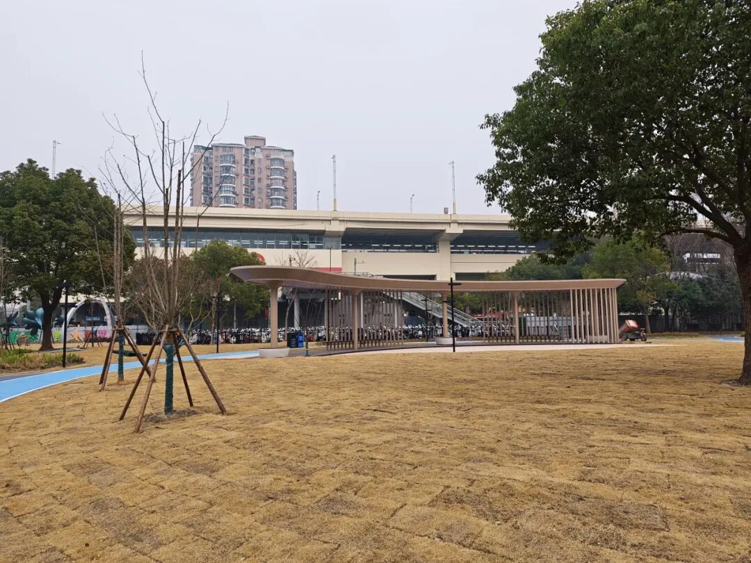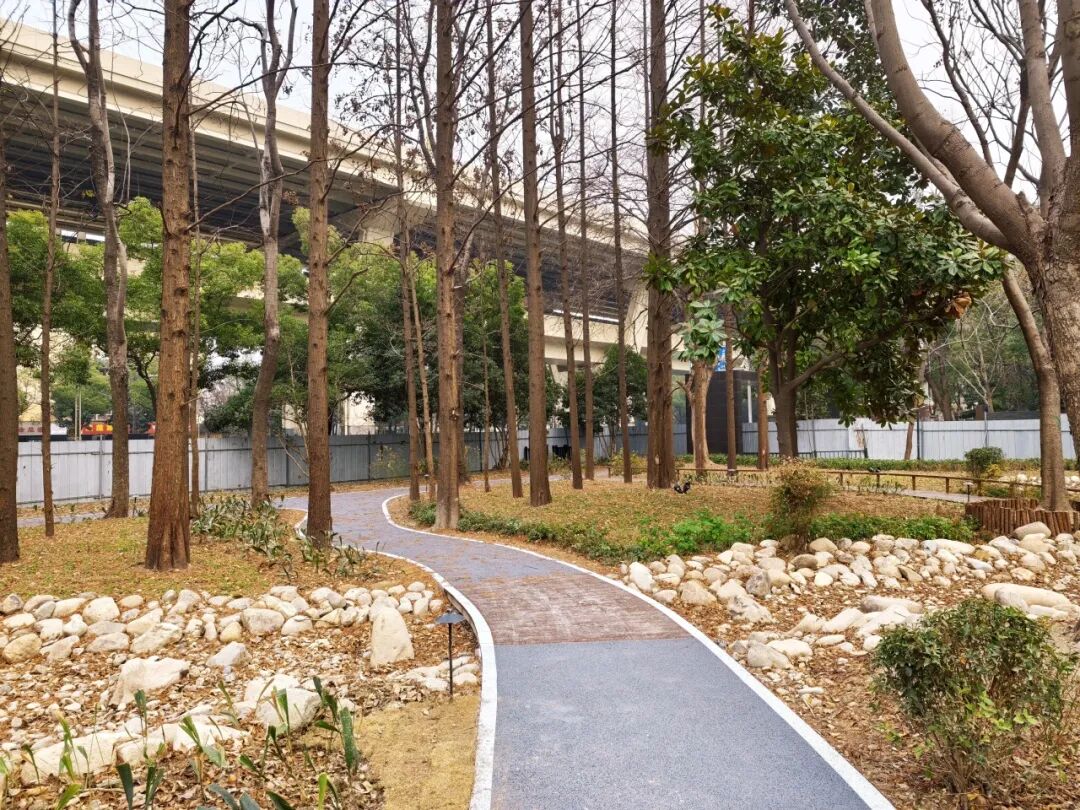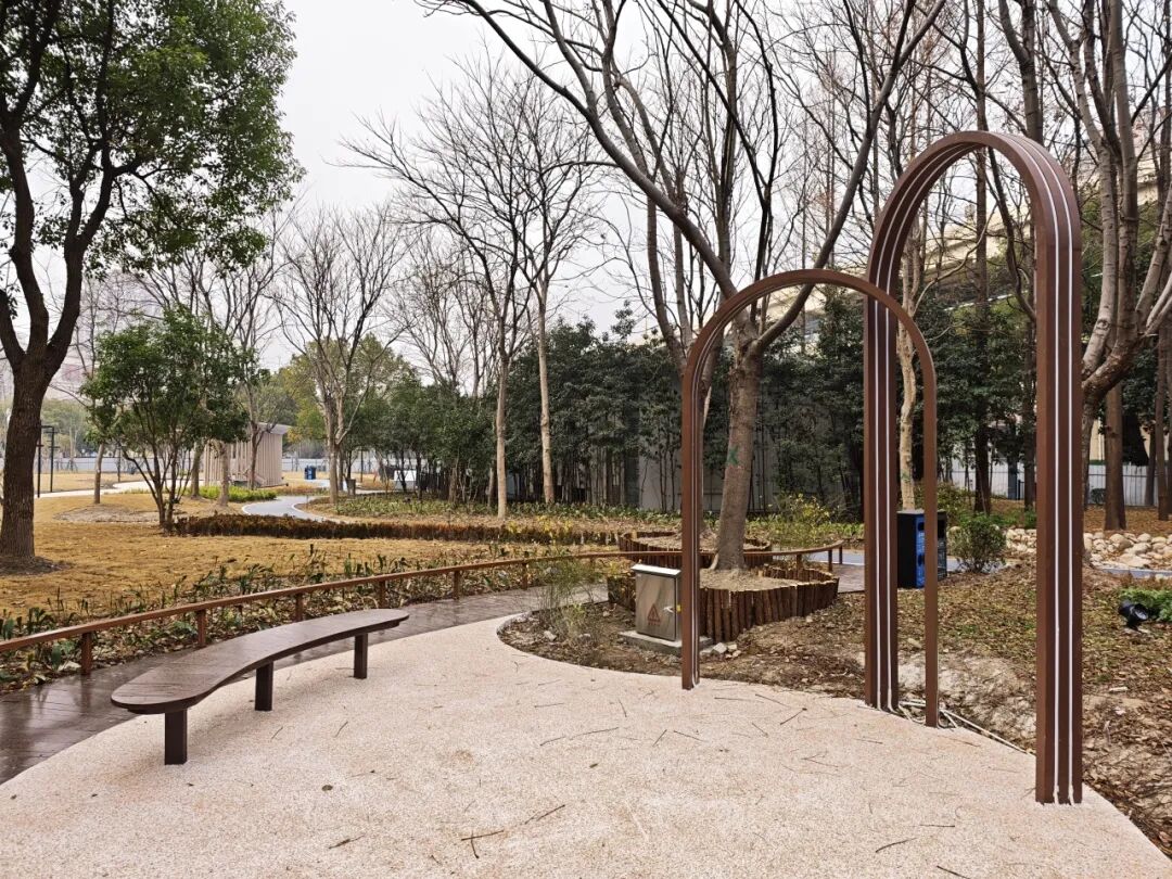 公园保留了原有长势良好的香樟、水杉等乔木,新增白玉兰主题树种,并搭配四季常绿、耐阴观赏的草花与地被植物,打造层次丰富、季相分明的植物景观。虽然目前时值冬季,草木尚未繁花似锦,但园内绿植已基本栽种完成,静待花期来临后渐次绽放其完整的景观效果。