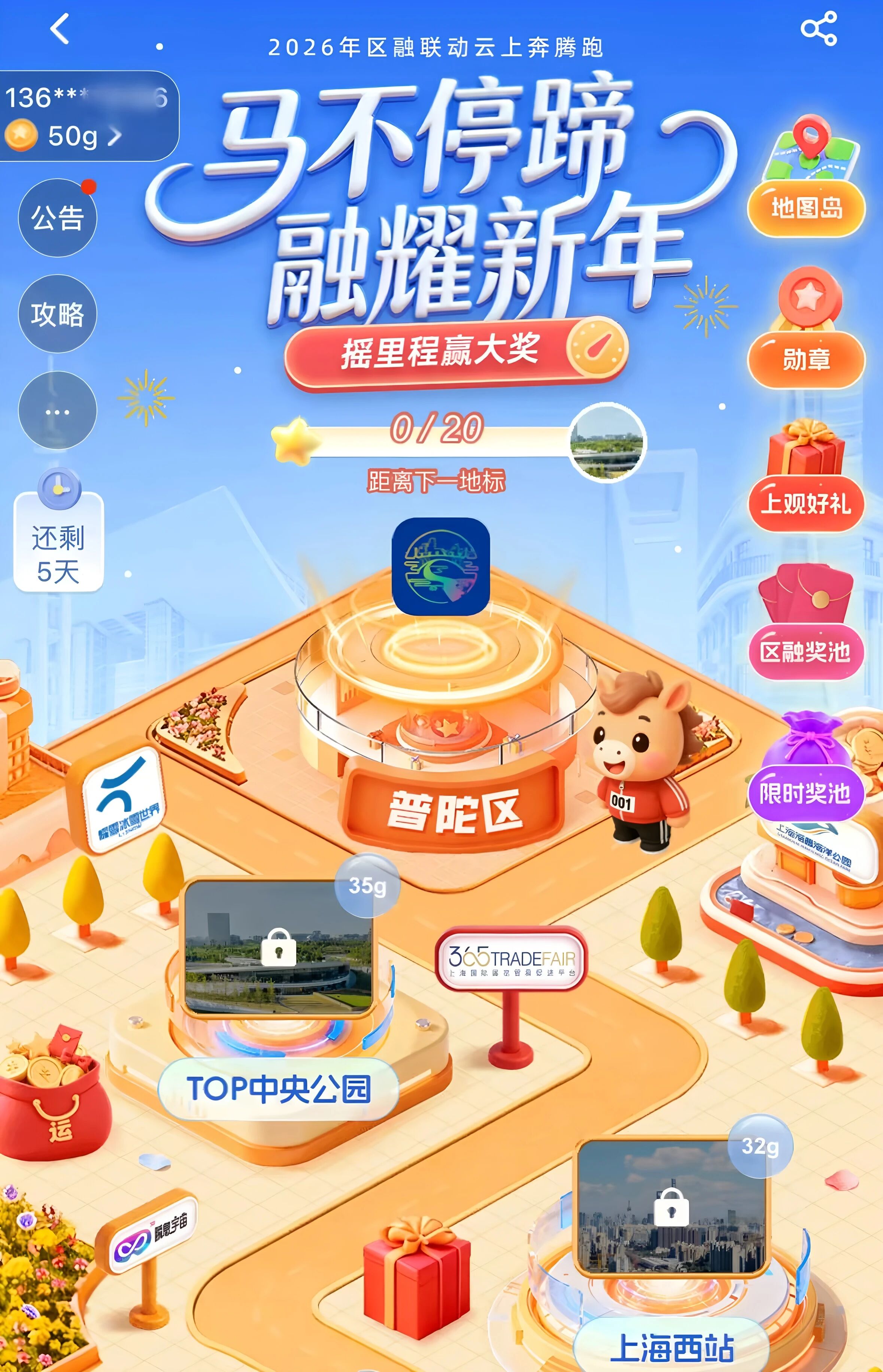 马年新春将至,申城处处涌动着喜庆气息。由上观新闻App联合上海区级融媒体App共同推出的“马不停蹄·融耀新年”云上跑活动,于今日正式与广大市民见面。这不仅是一场辞旧迎新的线上狂欢,更是上海主流媒体系统性改革、探索“媒体+服务”新生态的一次有力实践。感兴趣的普陀居民,快来试试,有机会抽中大奖哦!