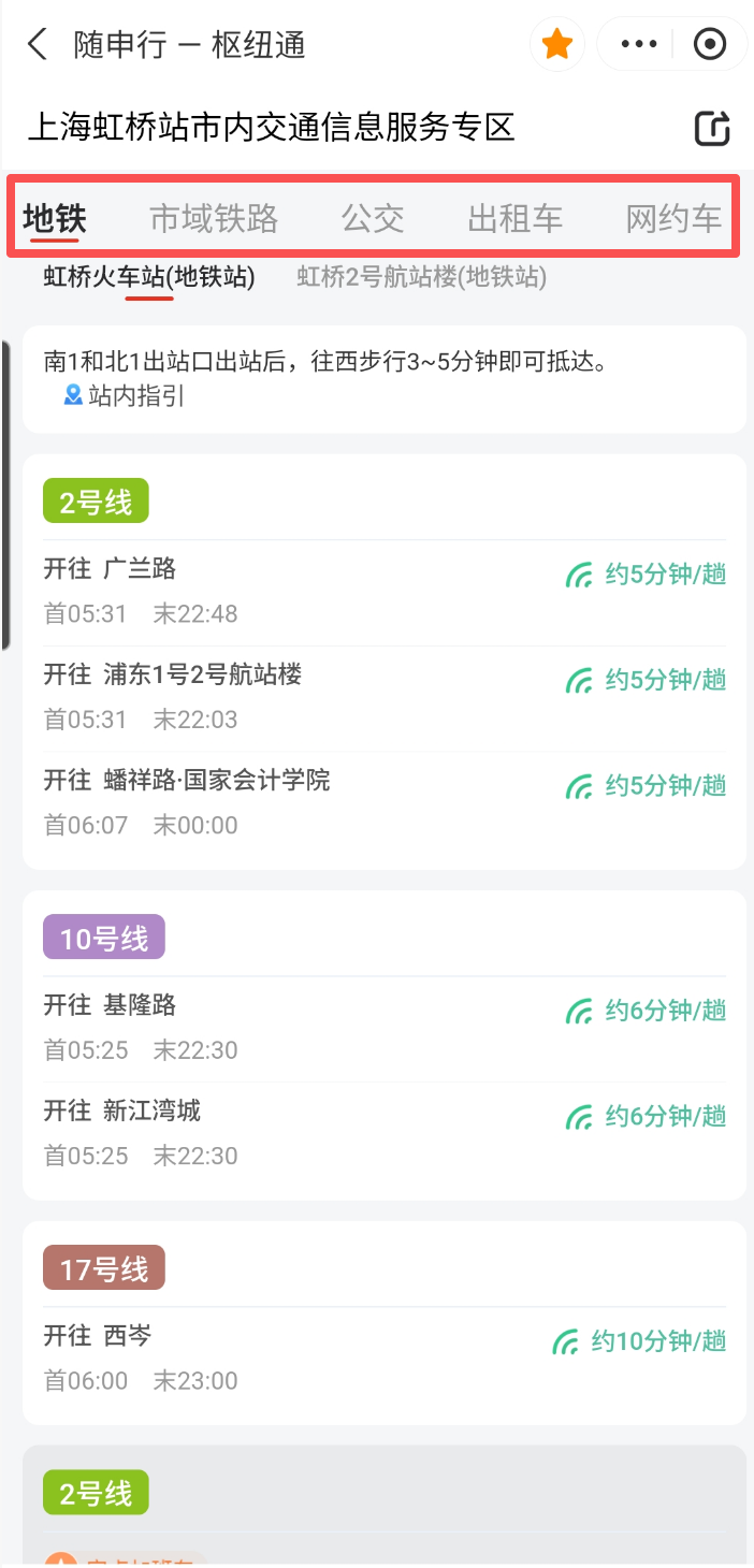 各位旅客抵沪后,打开“随申办市民云”(APP/微信小程序/支付宝小程序),首页搜索“枢纽市内交通”服务进入专区,通过左上角按钮可快速选择上海的各大站点,查看对应的交通信息。