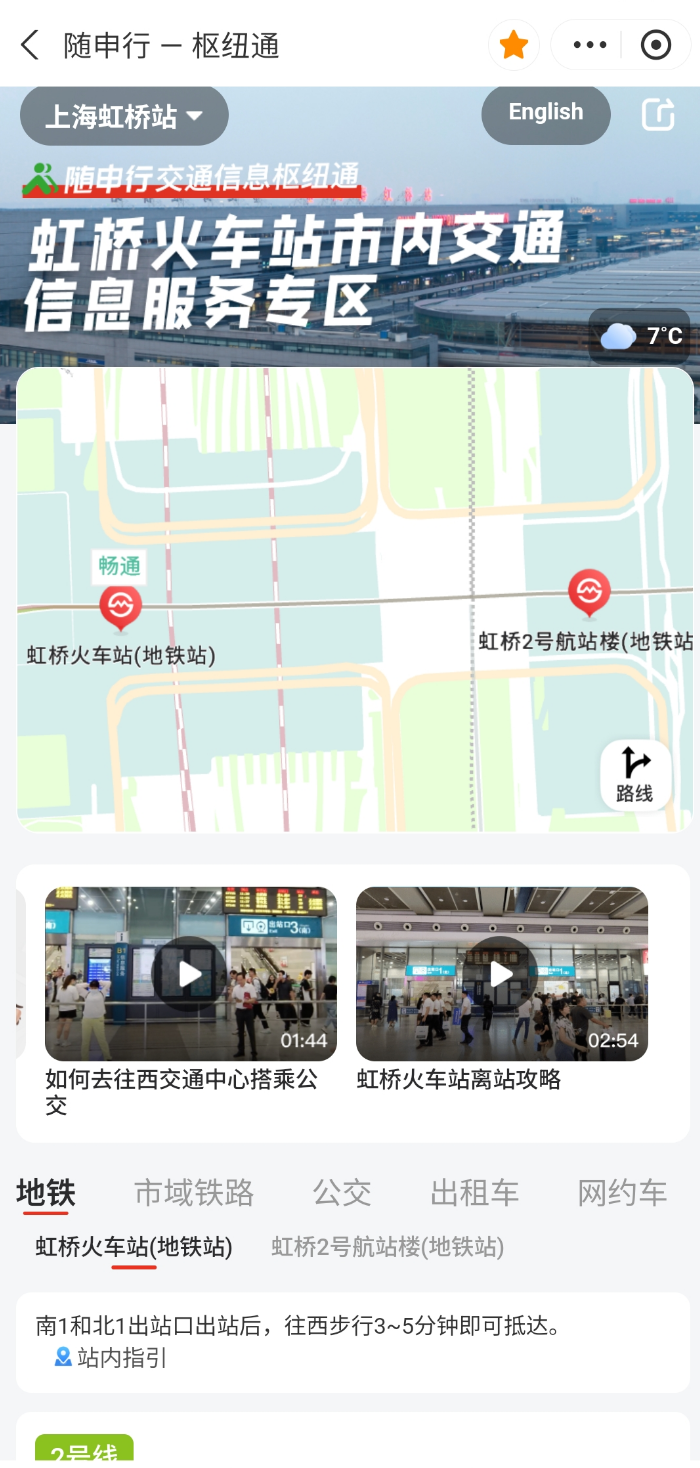 以“上海虹桥站”为例,进入交通信息服务专区后,可直接选择“地铁”“公交”“出租车”“网约车”等意向交通方式,查看交通线路情况及站内指引,快速出站或者换乘。有亲朋好友接送的旅客还可以选择“停车场”,查看车库空余泊位情况。