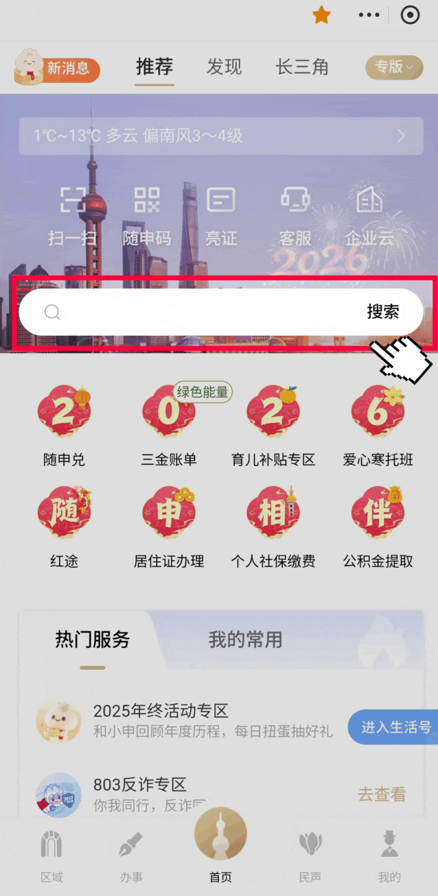 打开“随申办市民云”(APP/微信小程序/支付宝小程序),首页搜索“出行服务专栏”。