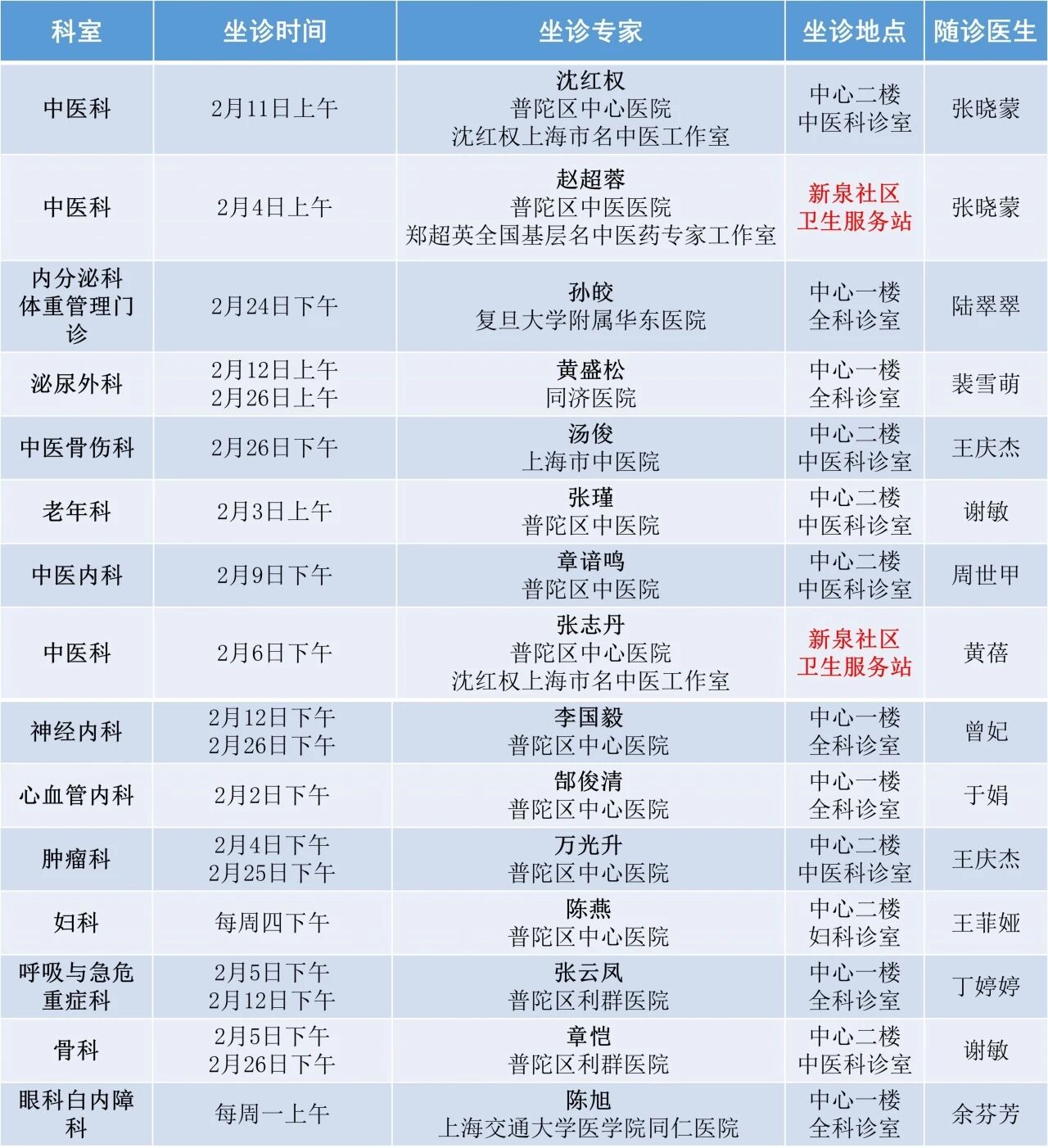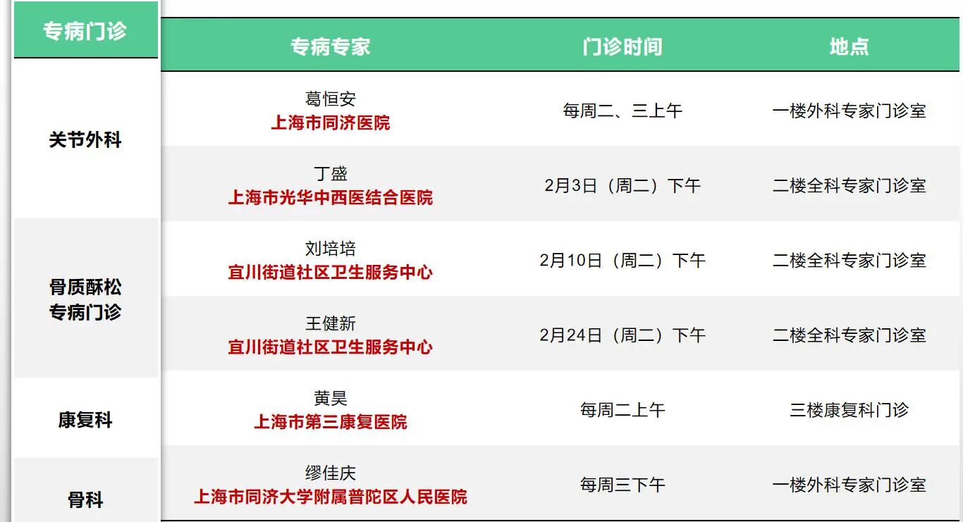 曹杨社卫全专联合门诊专家排班