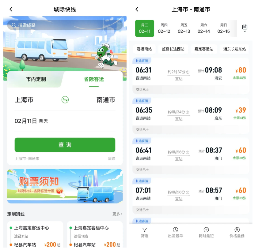 如今,旅客无需在不同平台或站点间反复查询。通过“随申行”APP或小程序上的“城际快线”专区,可以实时查询前往全国超10个省份、80余座城市的班次与余票,并完成一键购票,让返乡的交通规划变得更省心。