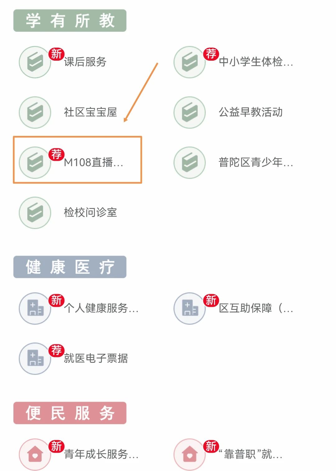 点击普陀旗舰店首页的“热门应用-更多”,找到“学有所教-M108直播”图标,点击进入;