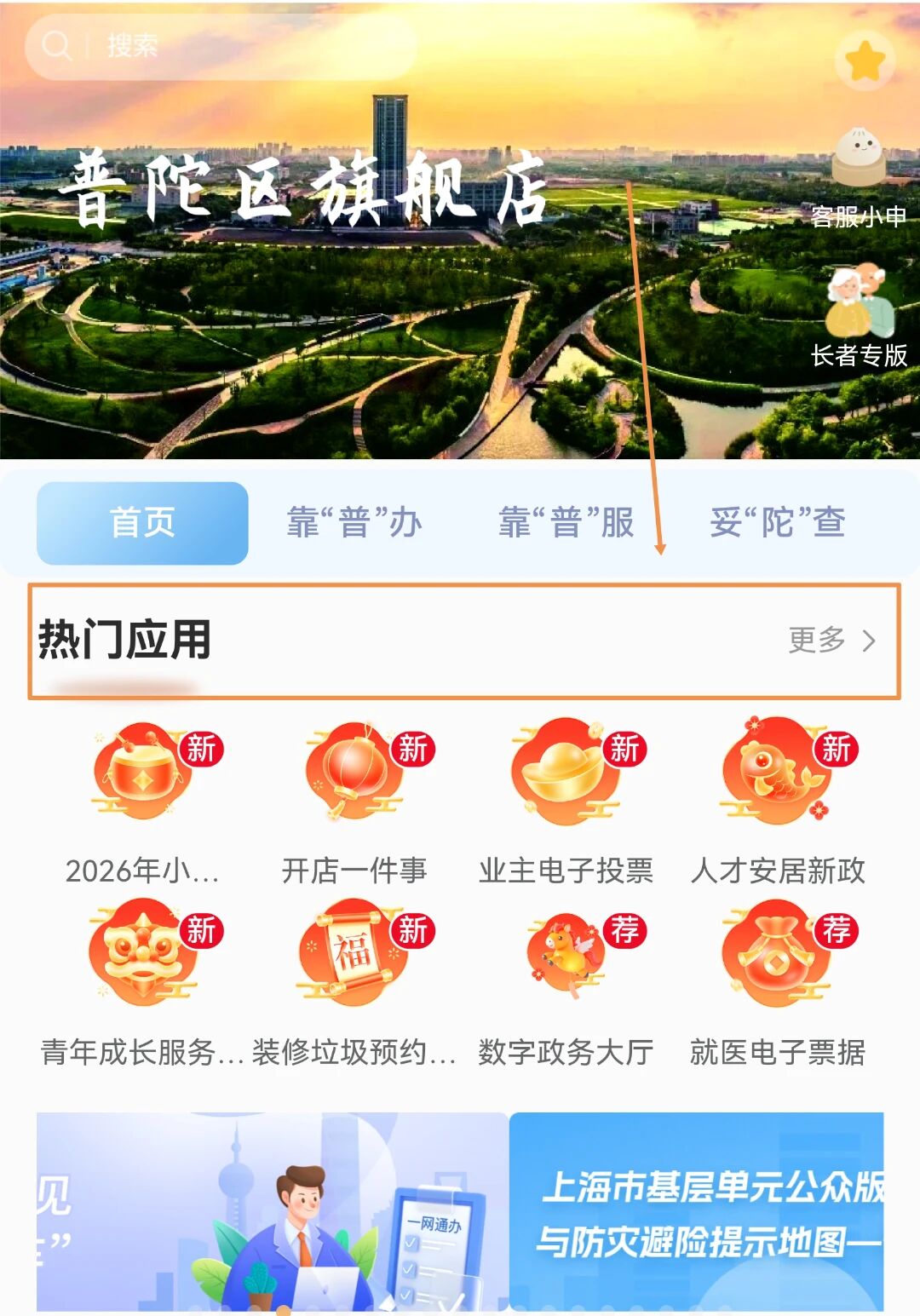 打开随申办市民云APP,在搜索栏中输入“普陀旗舰店”并进行搜索;